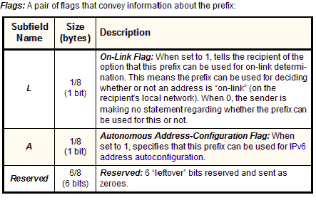 Prefix: The prefix being communicated from the router to the host in the Router Advertisement message. The Prefix Length field indicates how many of the 128 bits in this field are significant (part of the network ID). Only these bits are placed in the Prefix field, the remaining bits are cleared to zero.